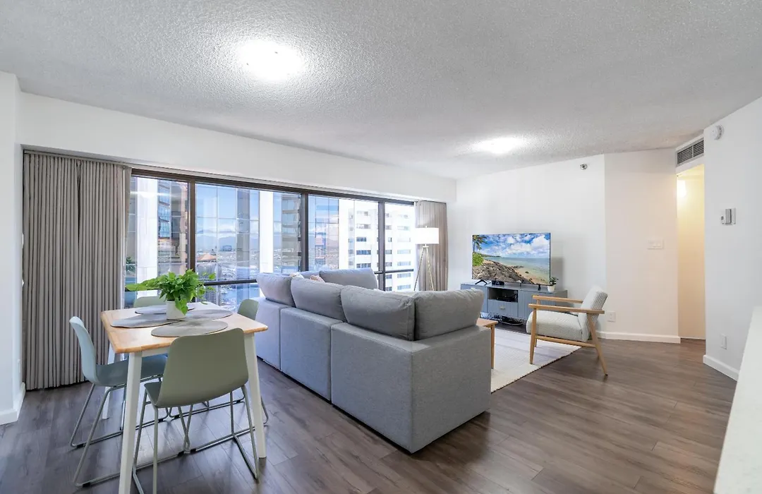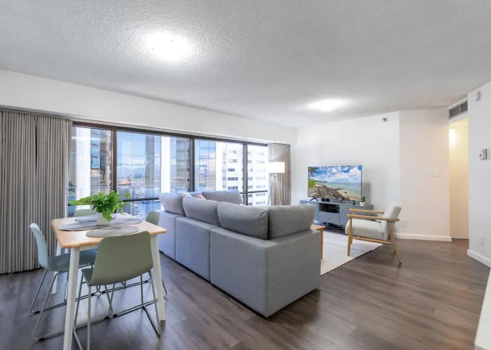 広々とした74m²のDowntown Honolulu Skyview - 1Bed&Den- Free Parkingアパートメントはハワイ州立美術館から徒歩で6分の場所に位置し、海の景色を見渡せます。 ホノルルの海辺のロケーションにある寝室1室のアパートは、カメハメハ大王像少し離れたです。